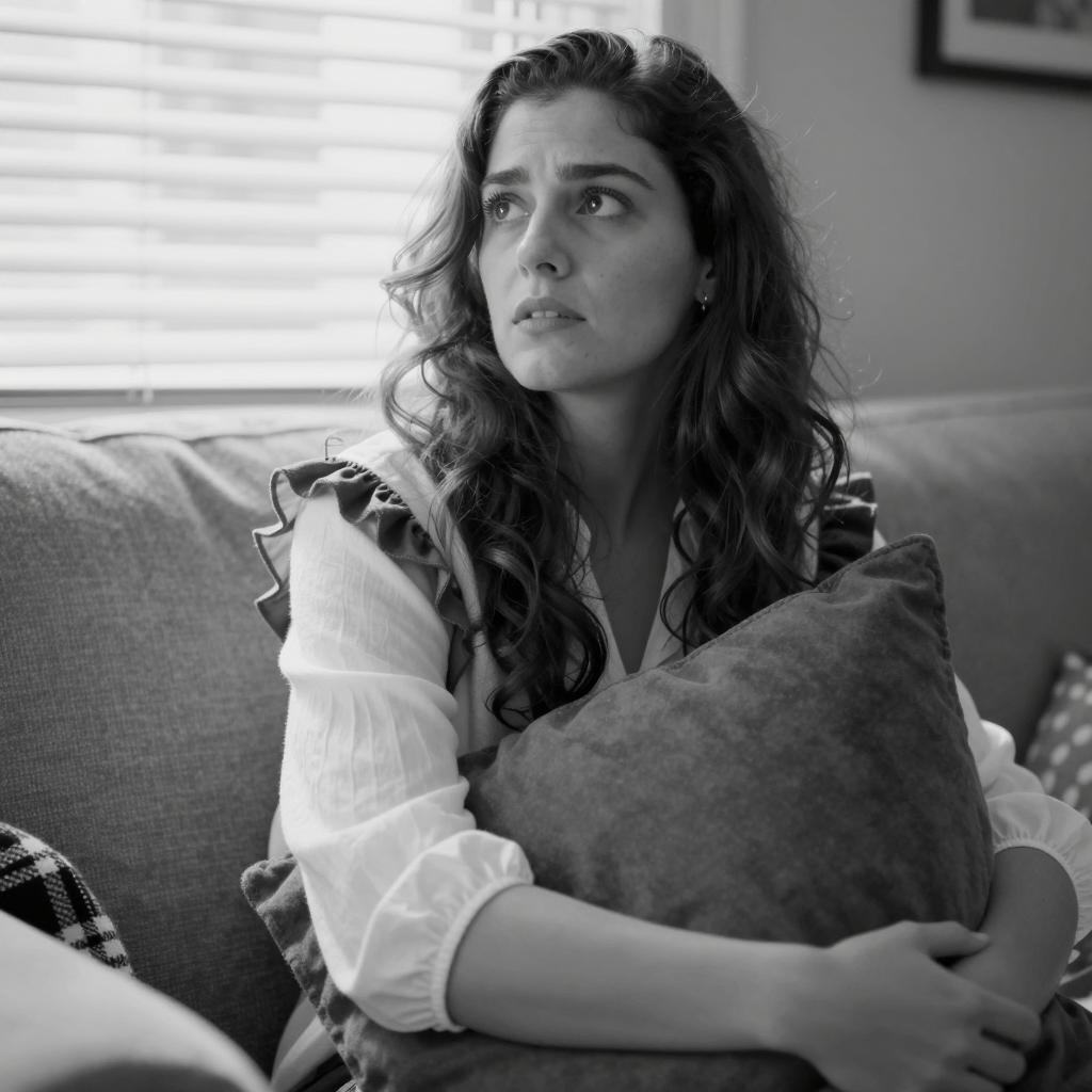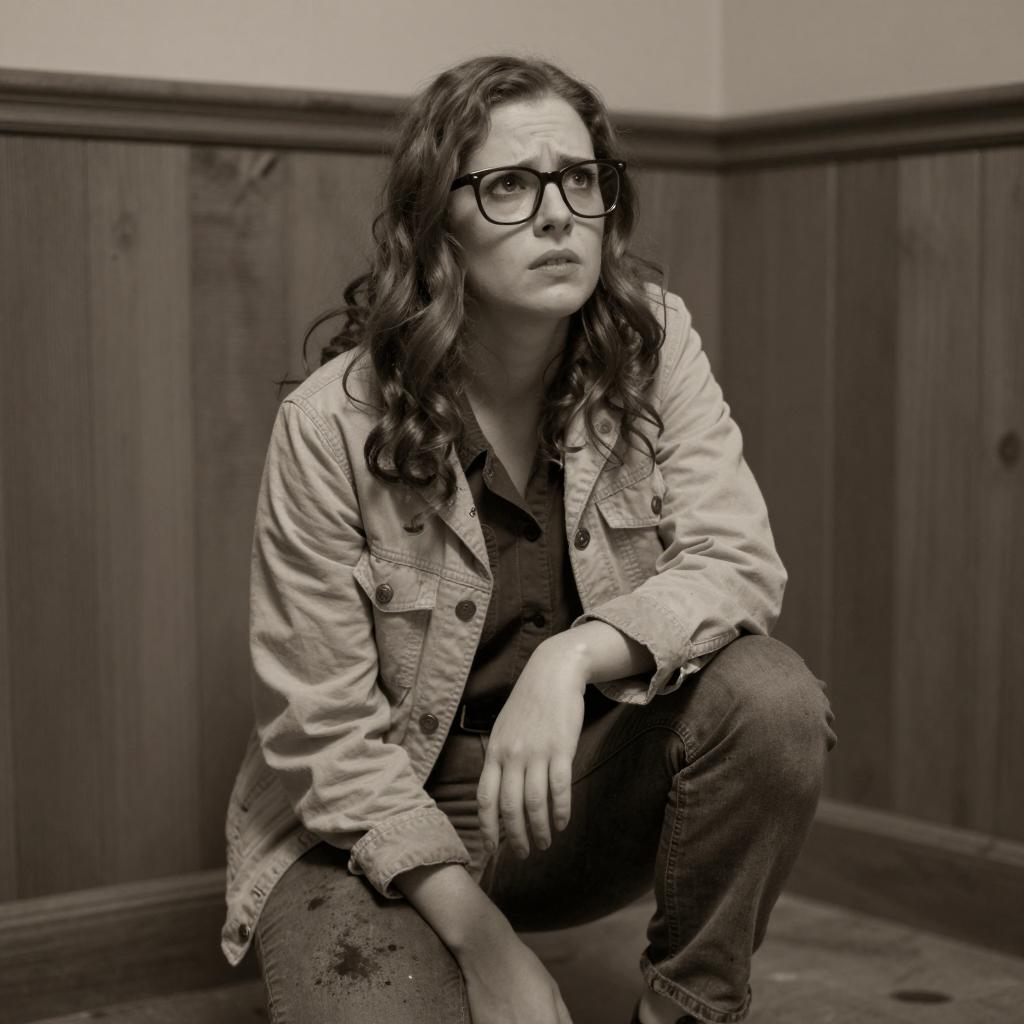 Woman with wavy brown hair and large glasses, wearing a light-colored jacket and dark shirt, crouches in a wooden-walled room. Blood stains her pants. She looks up with a concerned expression. Sepia-toned photograph.
