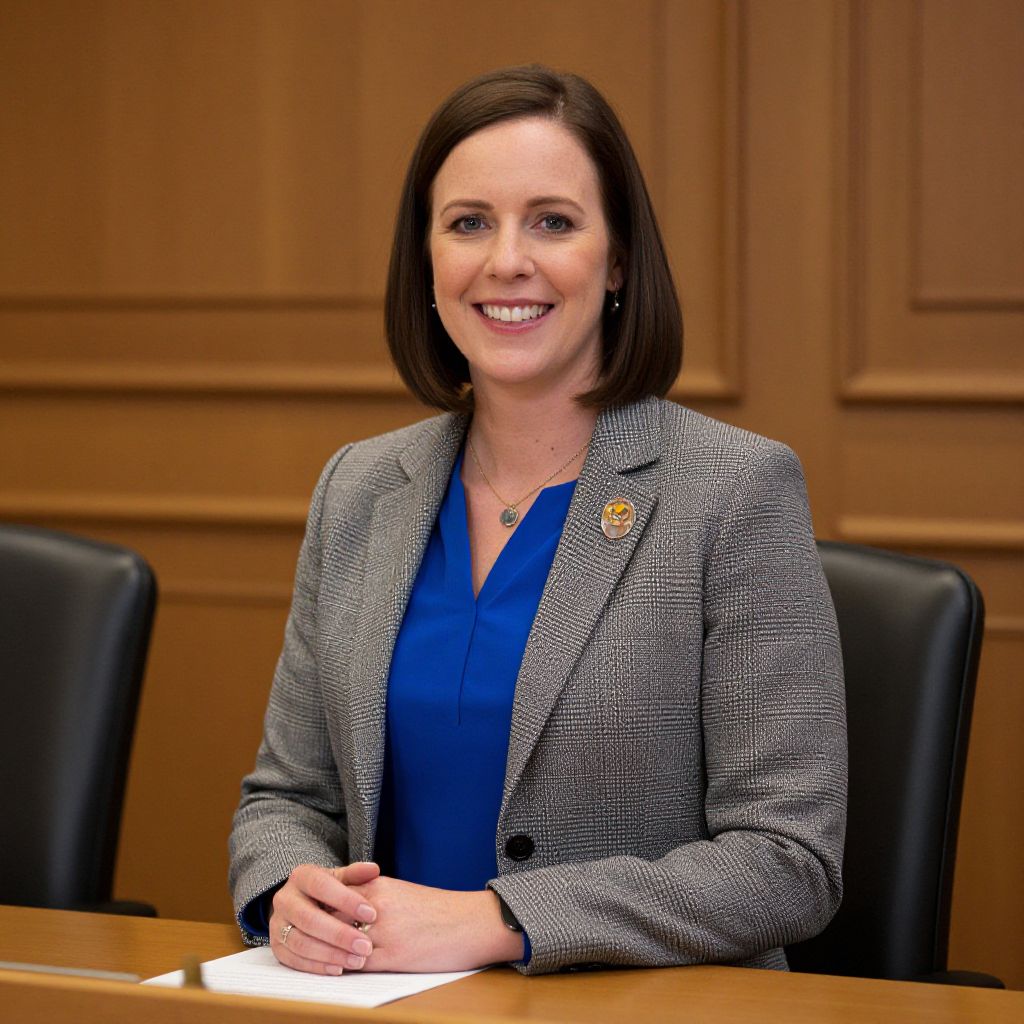 Photograph of a Caucasian woman with straight, shoulder-length dark brown hair, wearing a gray textured blazer over a bright blue blouse. She has fair skin and is smiling slightly, showing her teeth. She wears a small round pin on her blazer and a delicate necklace. She is seated at a wooden desk in a professional setting, with a blurred flag featuring a blue and white circular design in the background. The lighting is even, highlighting her face and upper body. She exudes a professional and approachable demeanor.