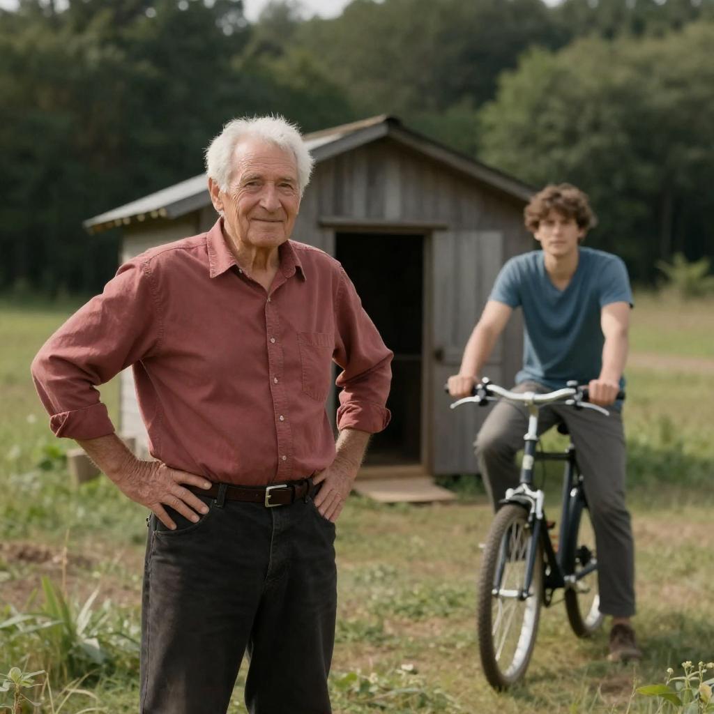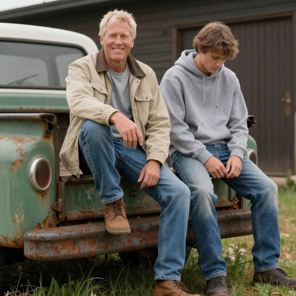 Photograph of two men sitting on the back of an old, green, rusty pickup truck. The older man with short, blond hair wears a beige jacket and blue jeans, smiling. The younger man with brown hair, wearing a gray hoodie and blue jeans, looks downward. Grass and a wooden building in the background. Both men have casual, relaxed poses.