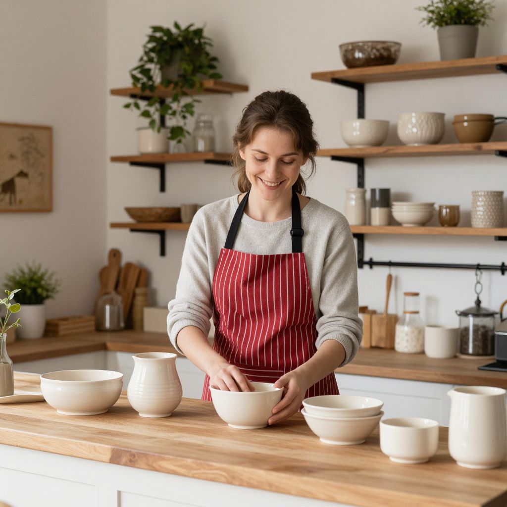 Woman arranging ceramic pottery on a wooden countertop in a cozy kitchen setting, showcasing a red-striped apron and a warm smile amidst open shelves filled with decorative items and plants.