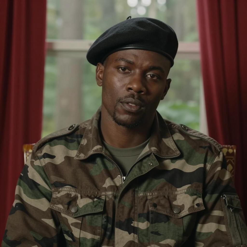 A dark-skinned man wearing a black beret and camouflage jacket, sitting indoors with red curtains and a forest view in the background. He has a serious expression, slightly parted lips, and visible stubble. The man is centered, facing slightly to the right. Greenery and tree trunks are visible through the window. A patterned chair is partially visible on the right.