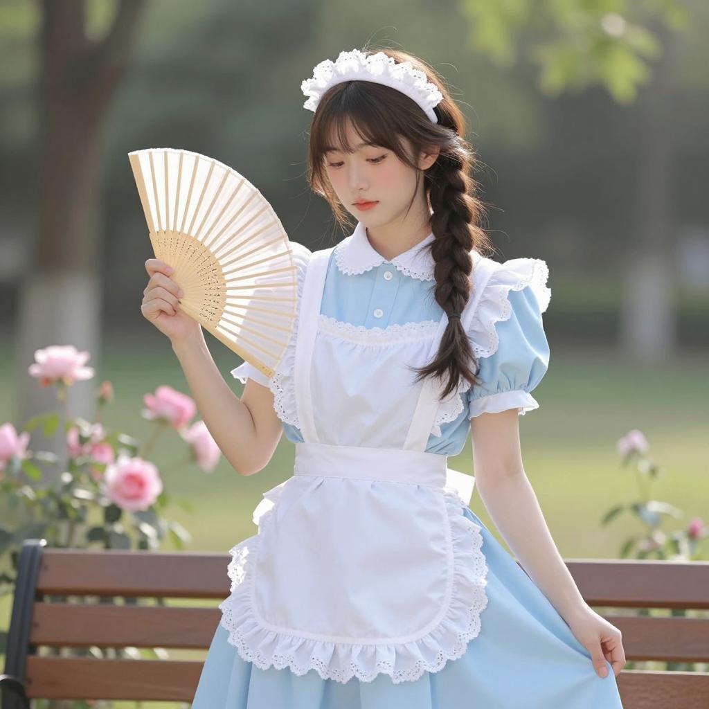 Summer day outfit, photorealistic portrait of a young woman, standing in a sunny meadow, wearing a sleeveless, floral-patterned summer dress with red and orange accents, long brown hair blowing in the wind, soft natural light, blurred green trees in the background, daytime, slight smile, hands gently holding the dress's hem, relaxed and serene expression, detailed ures in the dress fabric, warm colors, realistic shadows and highlights