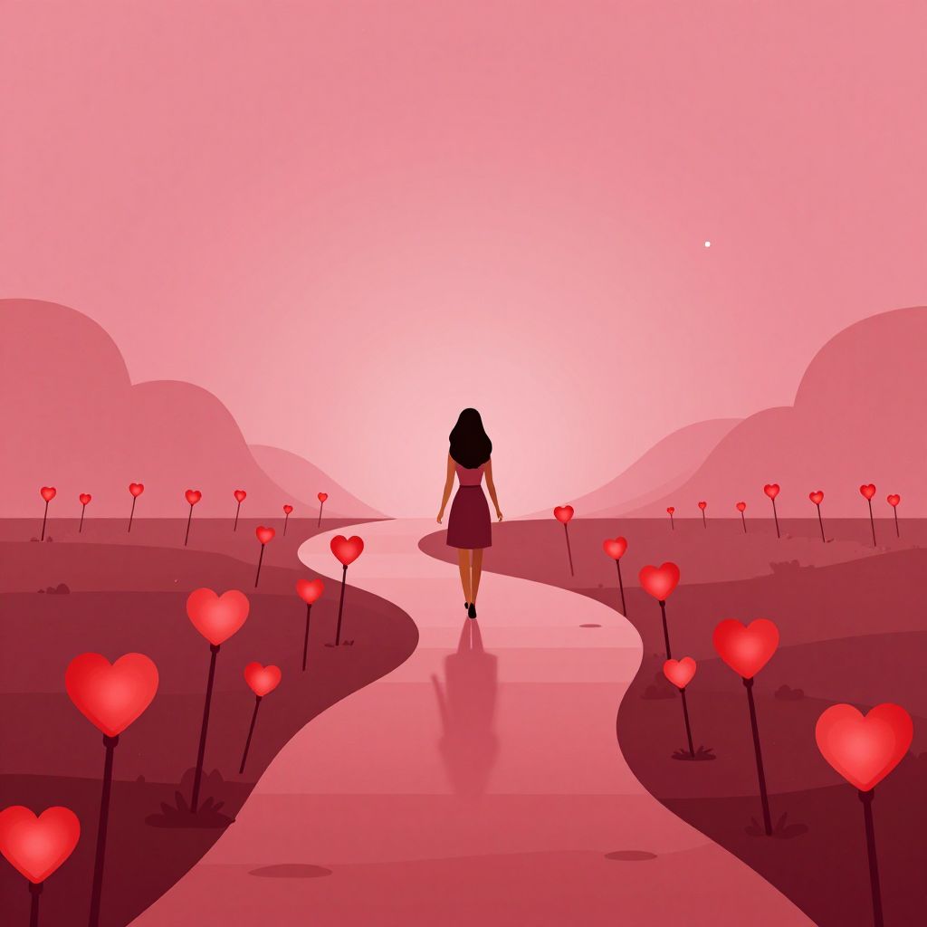 A woman walks down a winding path surrounded by red heart-shaped lights, set against a gradient pink-red background with minimalistic, celestial aesthetics and a flat vector illustration style.