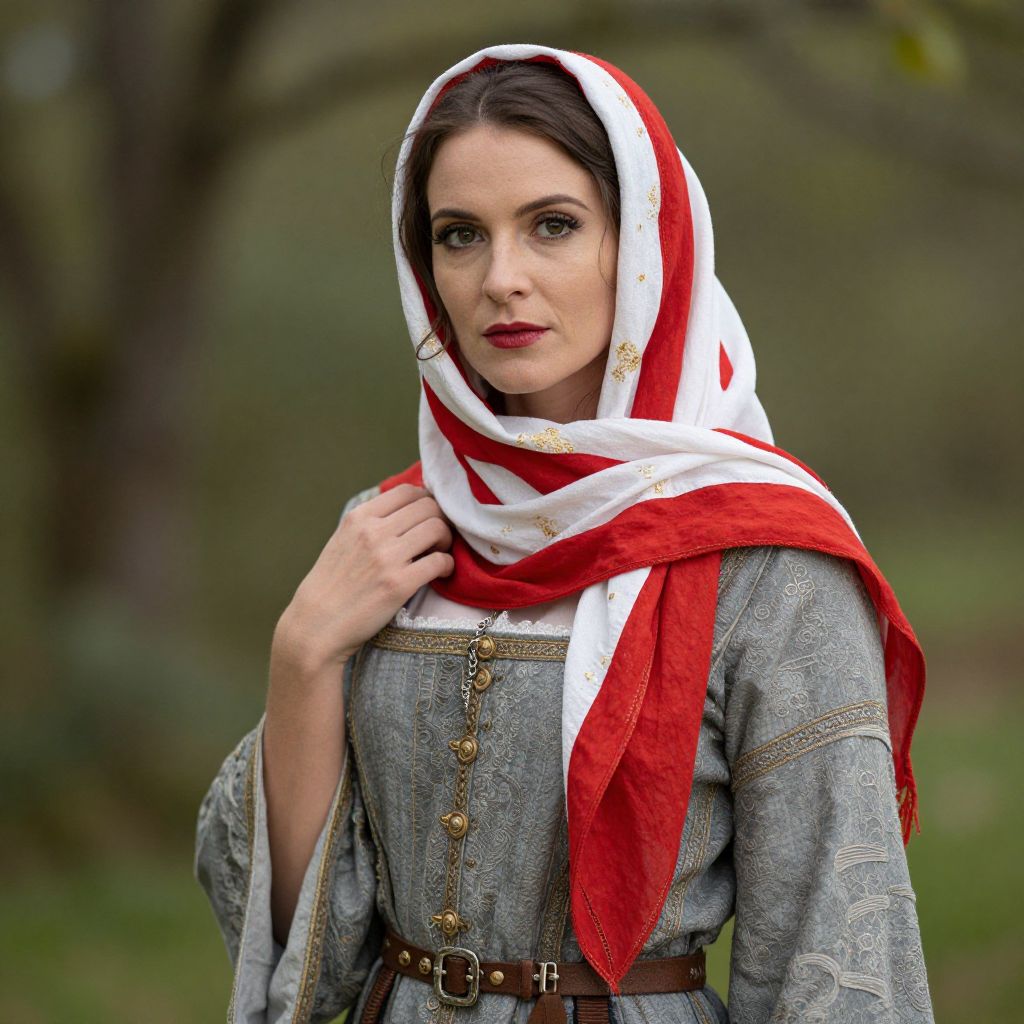 "Woman Wanda Fancy Dress, woman in medieval dress with red and white head scarf"