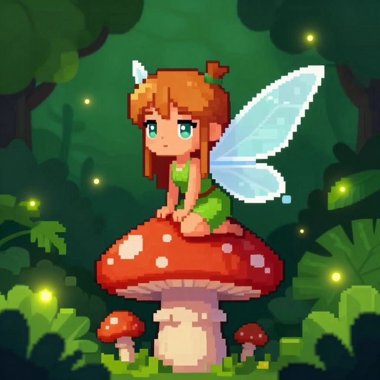 Pixie pixel art depicting a mischievous small fairy character perched on a mushroom, with sparkling eyes and delicate transparent wings, detailed in charming pixel art reminiscent of retro video games, set against a backdrop of lush green foliage and twinkling fireflies.