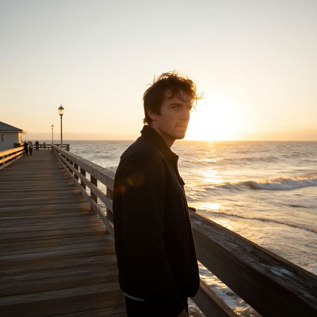 [[man,oceanside pier photos]]Captivating portrait of a solitary figure, standing at the edge of an expansive oceanfront pier, eyes fixed on the horizon as the sun dips below the waves, bathing the scene in warm golden hues, wooden planks worn smooth by time and weather, sea spray misting his face, wind whipping through his hair. Man has masculine face and piercing eyes