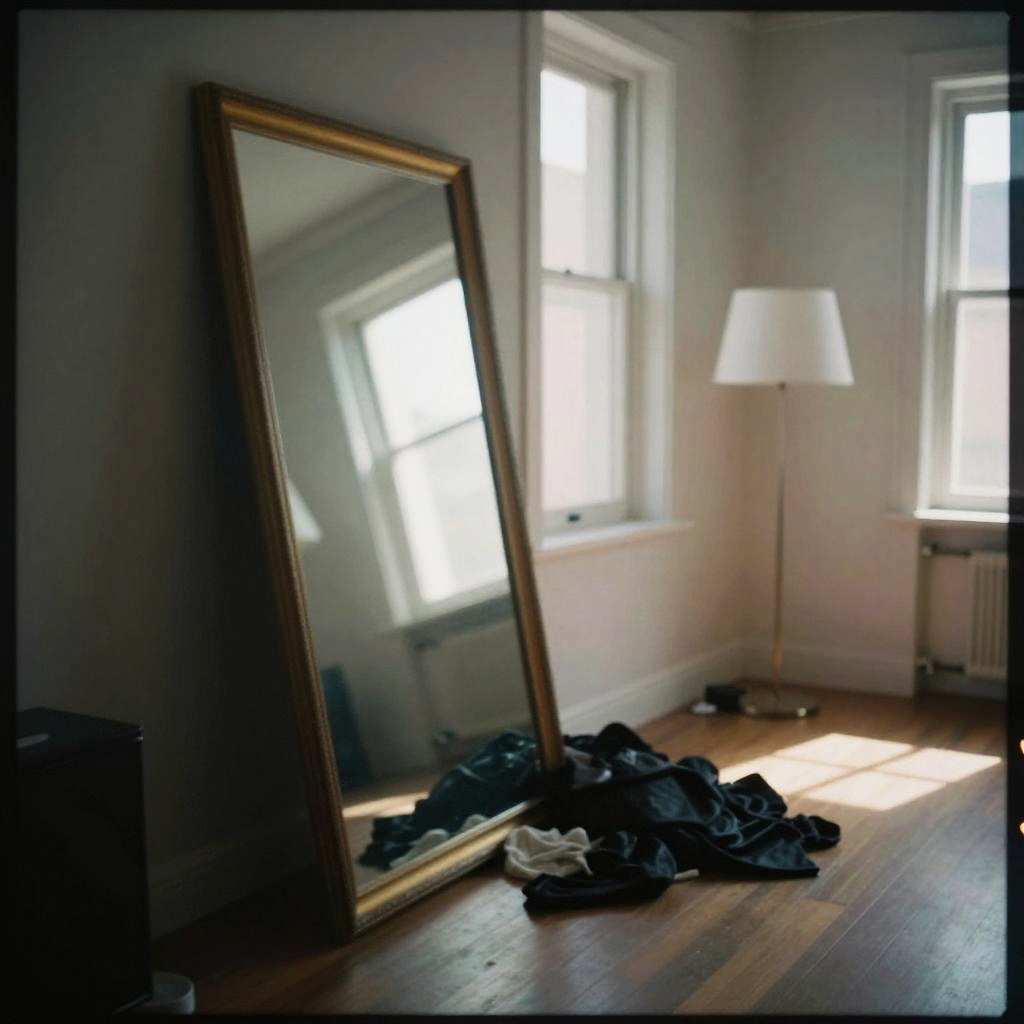 Photograph of a sunlit room with a large, gold-framed, leaning mirror on a wooden floor, reflecting light from two rectangular windows. Clothes, including dark and light garments, are scattered in front of the mirror. A white, cone-shaped floor lamp stands to the right, next to a white radiator. The walls are painted a soft gray, creating a calm, minimalist atmosphere. The image has a slight vignette effect, focusing attention on the mirror and clothing. Natural light creates soft shadows, enhancing the room's serene and simple aesthetic.