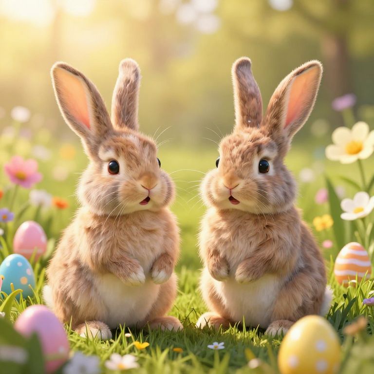 In a whimsical meadow bathed in golden sunlight, two anthropomorphic bunnies stand amidst a field of vibrant Easter eggs and blooming flowers, their fluffy forms and expressive faces defying the ordinary boundaries between animals and human-like emotions.