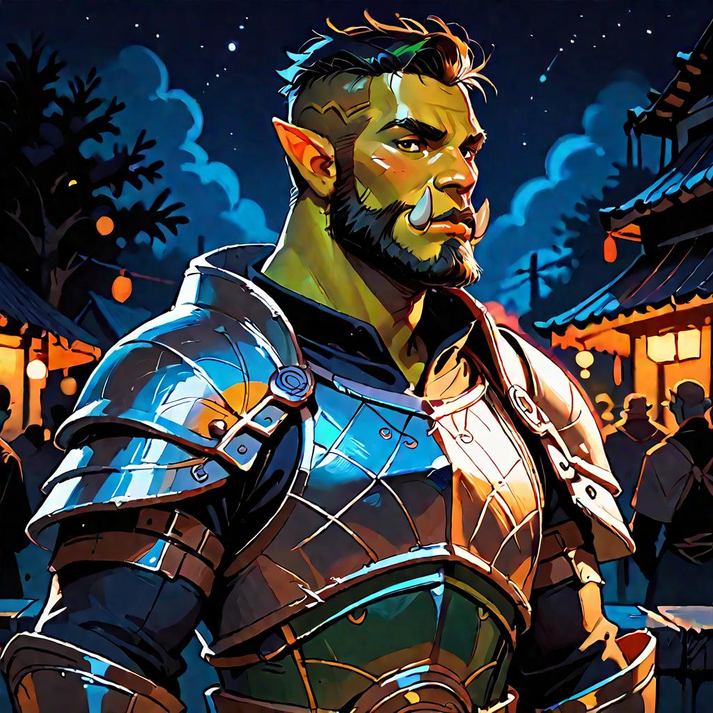 Score_9, score_8_up, score_7_up, dark theme, low light, solo, male focus, mature male, orc, green skin, tusks, beard, outdoors, armor, looking at viewer, shoulder armor, breastplate, upper body, closed mouth, pauldrons, night, night sky, standing