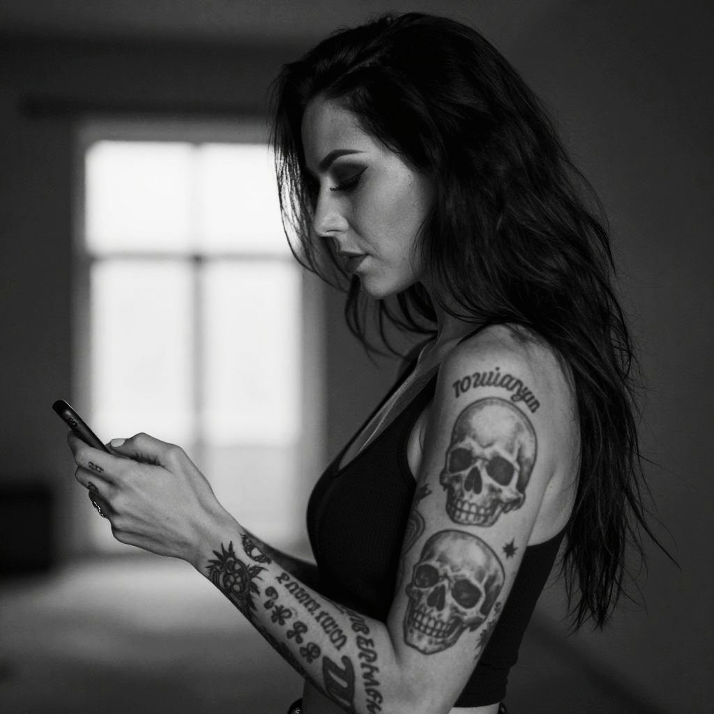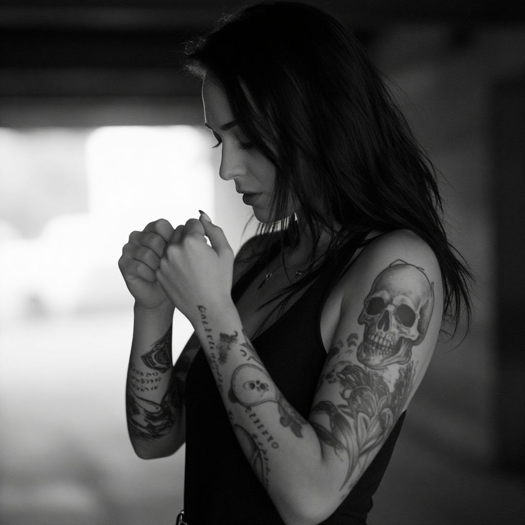 Black-and-white photo of a woman with long dark hair, facing left, showing off heavily tattooed arms. She's wearing a sleeveless black top. Her tattoos include detailed designs, text, and a skull on her left arm. Background is blurry with bright light in the distance. The image has a moody, edgy vibe.