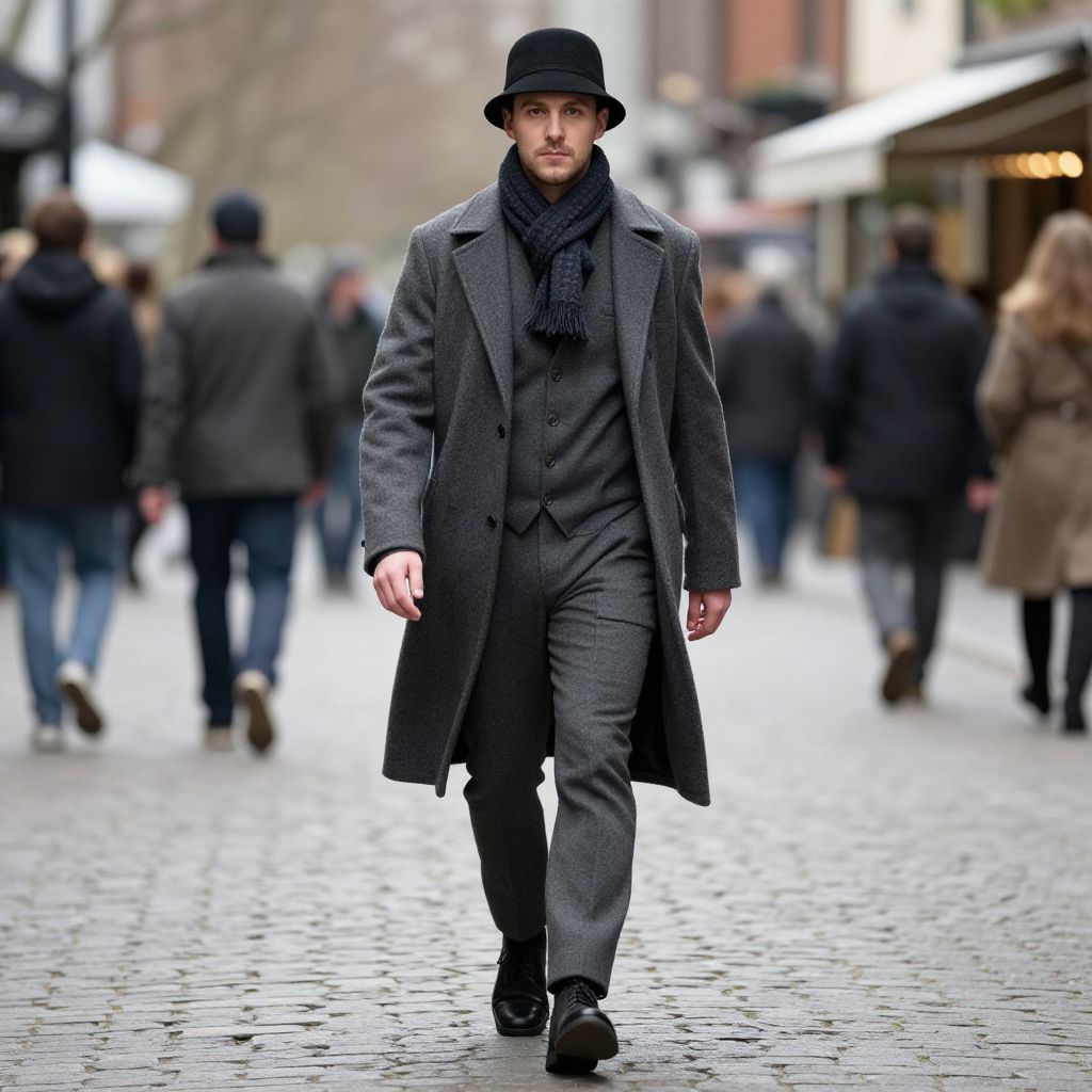 Photograph of a bearded Caucasian man with light skin, wearing a black bowler hat, dark gray three-piece suit with a long overcoat, black scarf, and black shoes. He walks confidently on a cobblestone street in an urban setting, with blurred pedestrians in dark winter clothing in the background. The street is lined with storefronts and trees, and the overall mood is cool and overcast. The man's attire and confident stride suggest a fashion-forward, urban style.