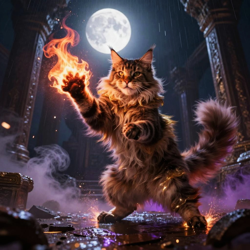 (full body) large fluffy Maine Coon cat, fire-wielding mage casting spell, in ruined ancient temple under full moon, gold, crimson, and violet predominate, hyper-detailing, hyper-realism, tack sharp, cinematic splash screen energy, action-packed composition, dynamic pose, rain and sparks, smoke plumes, glossy reflections, dramatic rim light, volumetric fog, motion blur trails, embers, HDR, film grain, photoreal lighting, rich textures, epic mood