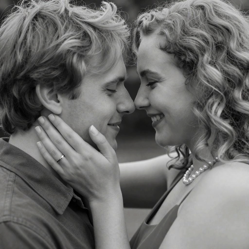 Black-and-white photograph of a man and woman in formal attire. Man in dark suit, white shirt, black bow tie, short dark hair, sitting with legs crossed. Woman in dark dress, elaborate necklace, short curly hair, sitting on ground, leaning on man, smiling, hands on necklace. Background with tree and foliage. Man looks at woman, woman looks at man. Man's left arm around woman's shoulder, woman's right hand on man's chest. Dim, soft lighting.