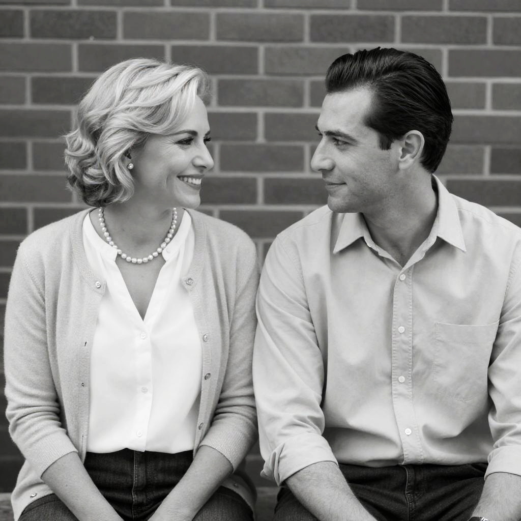 Black-and-white photograph of a man and woman dressed in formal evening wear sitting closely together outdoors. The man wears a dark suit, white dress shirt, and black bow tie, with short dark hair. The woman wears a dark elegant dress and an elaborate statement necklace, with short curly hair. They sit side by side on the ground, the man with his arm around the woman's shoulder, both looking at each other smiling. The background features tree and foliage, with dim, soft lighting creating an intimate atmosphere.