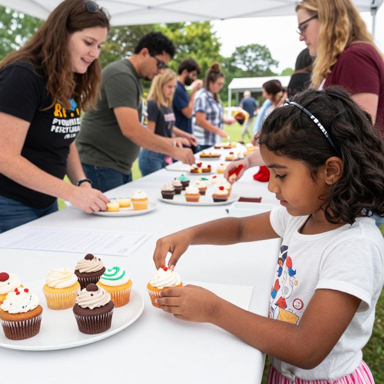 Photograph of a outdoor event featuring a young girl with dark hair, wearing a white T-shirt with colorful designs, selecting a cupcake from a table. The table is covered with cupcakes topped with various decorations, including cherries and sprinkles. Several adults, including a woman with brown hair in a black T-shirt and a man with glasses, are standing behind the table, serving cupcakes. The background shows a white tent and green trees. The image has vibrant colors and a slightly blurred background, emphasizing the girl and the cupcakes in the foreground.