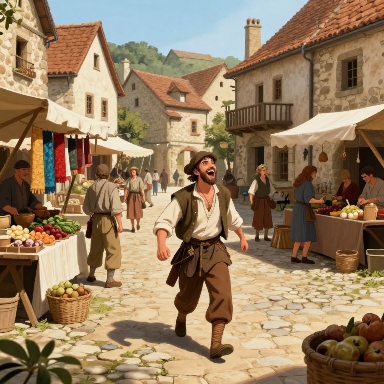 Chortle in a bustling medieval village square, lively market stalls with colorful fabrics and fresh produce, people laughing heartily, rustic cobblestone streets, warm sunlight casting long shadows, highly detailed, storytelling illustration