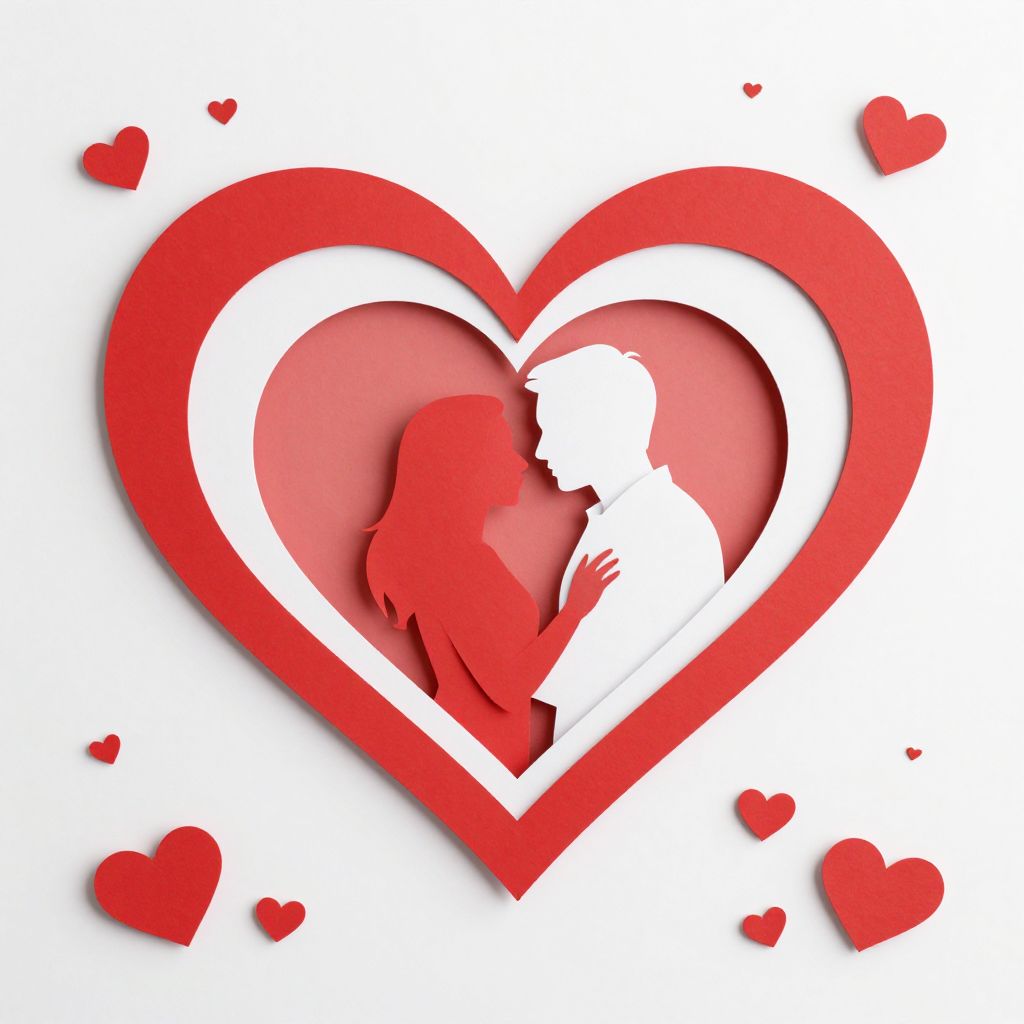 A paper cut art design featuring a red heart interlacing with a white heart, depicting a man kissing a woman in the middle, set against a Valentine's Day background with no shadows.