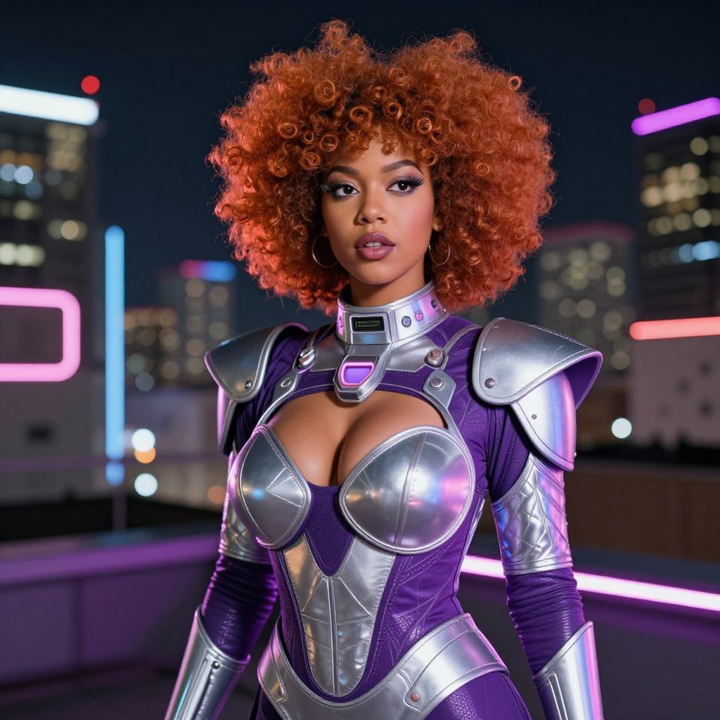 Photograph of a stylish Afro-futurist woman with a voluminous ginger afro, donning a futuristic silver and purple costume featuring geometric patterns and glowing accents, posing in a neon-lit urban rooftop cityscape at night, her face illuminated with warm, determined expression.. The woman has big tits and cute face
