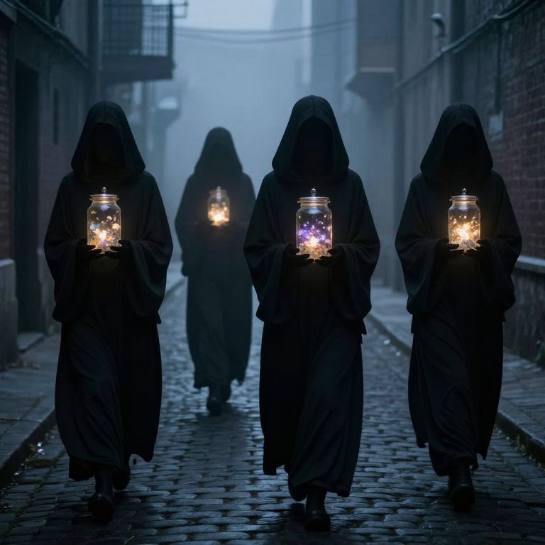 Silent figures cloaked in mystery traverse a misty alley, each cradling luminous glass jars that seem to hold flickering fragments of dreams, casting an otherworldly glow upon the cobblestone path.