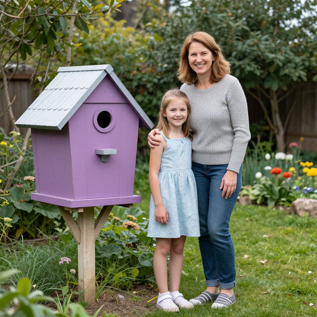 Smiling woman and girl standing in a garden next to a colourful hen house