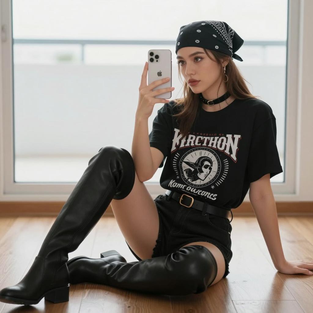 Woman sitting on wooden floor, taking selfie with white iPhone. Wearing black bandana, black graphic t-shirt, black choker, black thigh-high boots, black shorts. Right hand holding phone, left hand resting on thigh. Light-skinned, brown hair. Background: bright window, blurred outdoor view. Natural light.