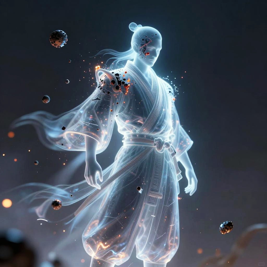 Ultra-detailed illustration of the light silhouette of a holographic wolf, phantasmagorical figure, (translucent skin:1.6), (translucent body:1.5), neon light, glowing fireflies, backlit, cyberpunk, soft natural volumetric cinematic perfect light, (chiaroscuro:1.4), ghost, motion blur, (ultra wide angle:0.8), fragmented body parts as mosaic fragmentation of body, spheres breaking off face, bleeding, mechanical fragmentation, high detail, floating parts, 8k, octane render masterpiece, masterpiece scale, beautiful depth of field, ultra wide field, ultra detailed CG perspective, ultra dynamic lighting, amazing shadows, vibrant colors, dramatic lighting, atmospheric