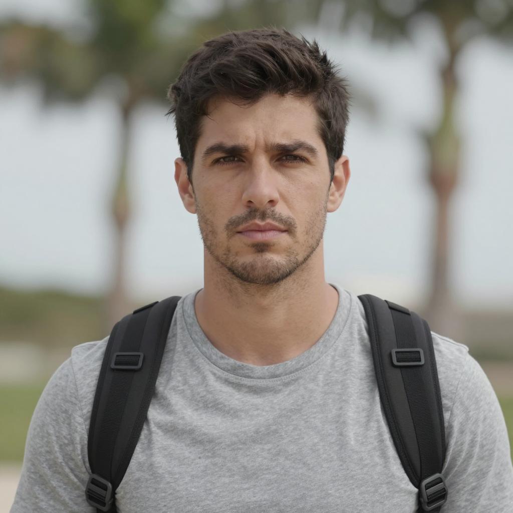 Scarface movie costume, photograph of a young man standing on a sunny suburban street, daytime, front view, medium shot, wearing a dark brown suit with a white shirt and black tie, dark brown hair, serious expression, hands in pockets, background with blurred trees and houses, sunlight filtering through trees, realistic style, casual urban setting, slight shadows, natural light