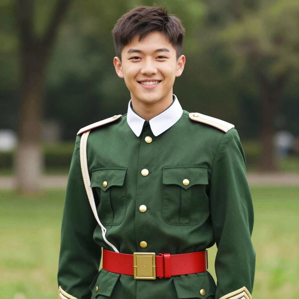 A photograph of a smiling young man with short, dark brown hair, dressed in a green military-style uniform with white epaulettes, gold buttons, and a red belt with a gold buckle. The uniform has a white collar and cuffs. He's standing outdoors against a blurred green background, suggesting a park or garden. The image has a vibrant, slightly exaggerated color style.