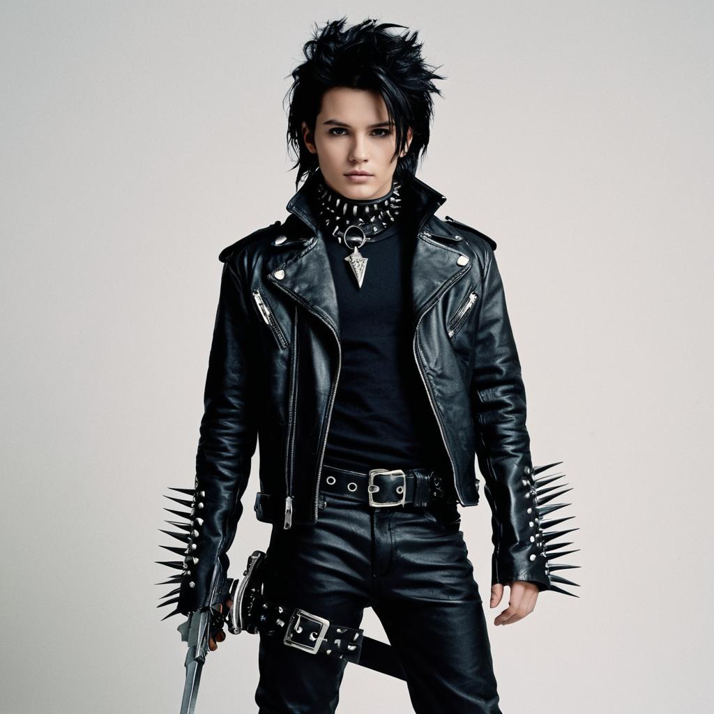 Full-body portrait of a young man with long black hair wearing a rave rodeo costume. He is dressed in a black cowboy hat, a black vest decorated with star accents, a white T-shirt, black pants, and studded black boots. Accessories include a red and silver belt, bracelets with spikes, and layered necklaces. The background is plain, emphasizing the subject's outfit and stance.