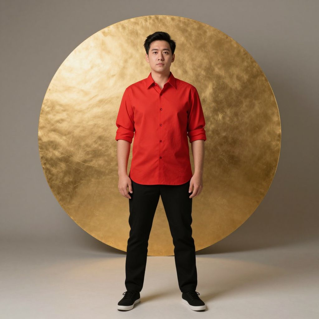 Outfit Funny Costume, man in a red shirt and black pants standing in front of a gold circle