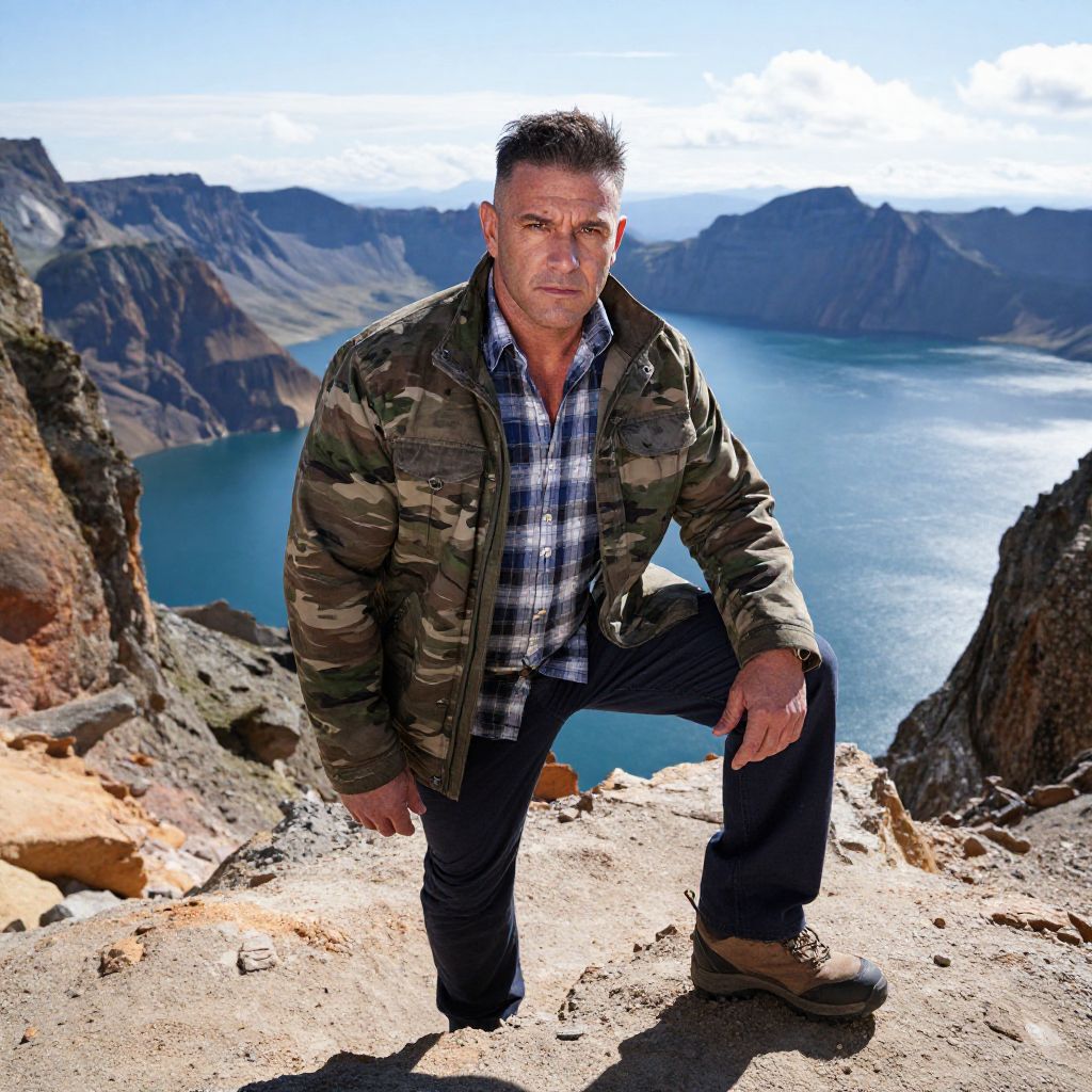 Photograph of a muscular, middle-aged man with short, dark hair and a serious expression, standing on a rocky cliff. He's wearing a camouflage jacket over a plaid shirt, dark pants, and hiking boots. He's crouched with one knee up, looking directly at the camera. Behind him is a stunning, blue lake surrounded by rugged, mountainous terrain under a bright sky.