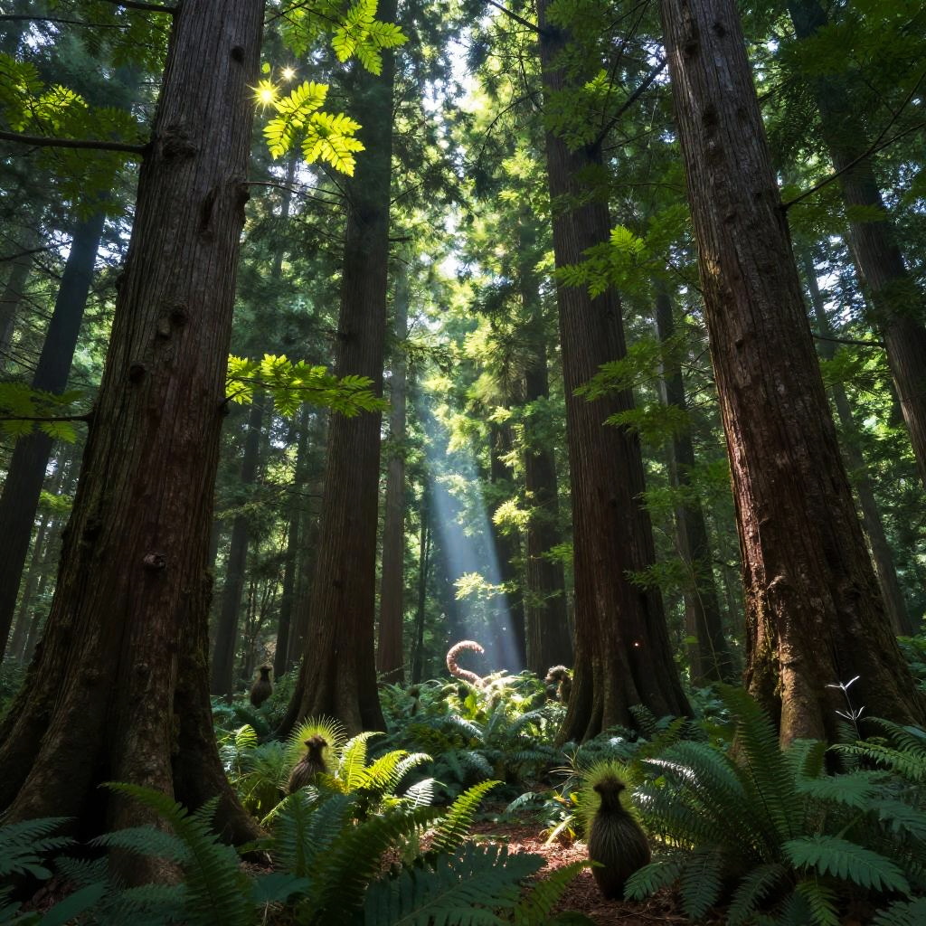 Imafe fantasy forest, ancient towering trees with luminescent leaves, magical creatures hidden among the bushes, sparkling light rays filtering through the canopy, rich textures and vibrant greens, enchanting and mystical mood