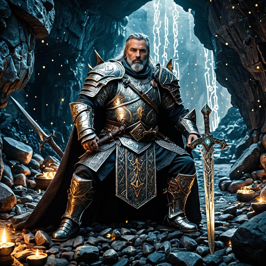 A ironclad warrior guarding a mystic cavern, heavyset middle-aged man age 45 wearing ornate silver armor, surrounded by glowing runes and scattered treasure, style: sword and sorcery, realistic, 8k, intricate details