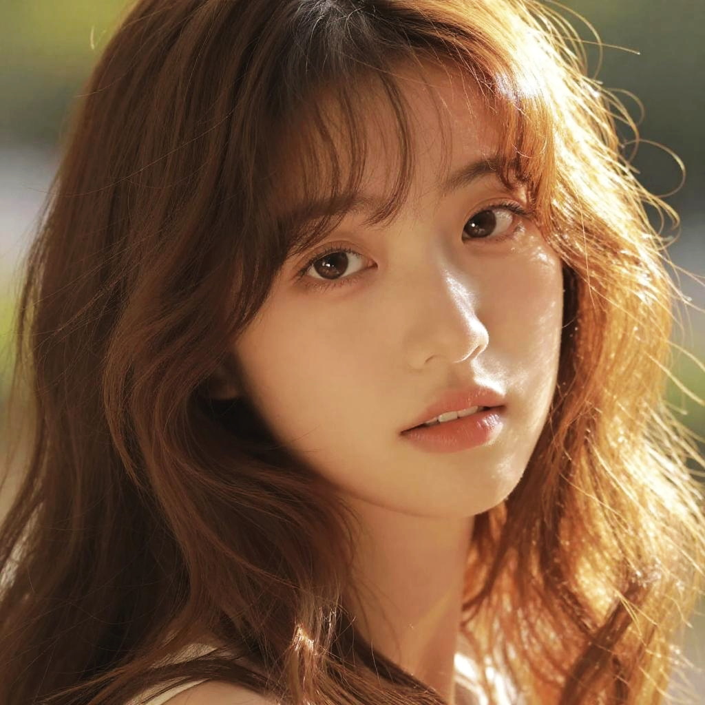 Close-up of light brown wavy hair with highlights, softly glowing under golden hour sunlight, delicate curls framing a serene female face, dreamy and ethereal atmosphere