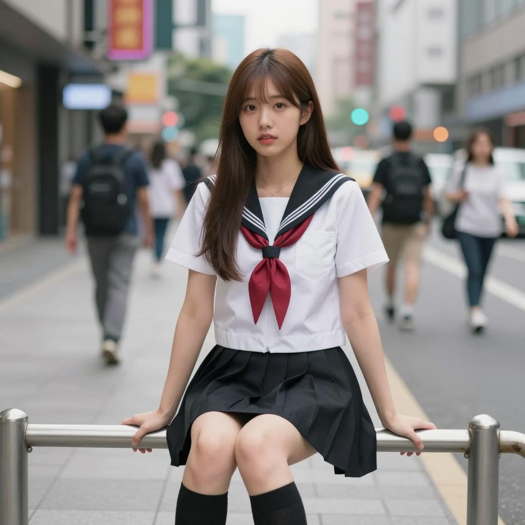 Urban Night Scene with Asian Schoolgirl