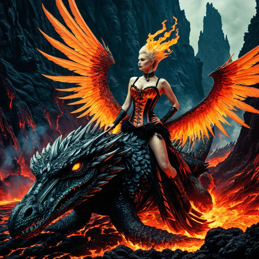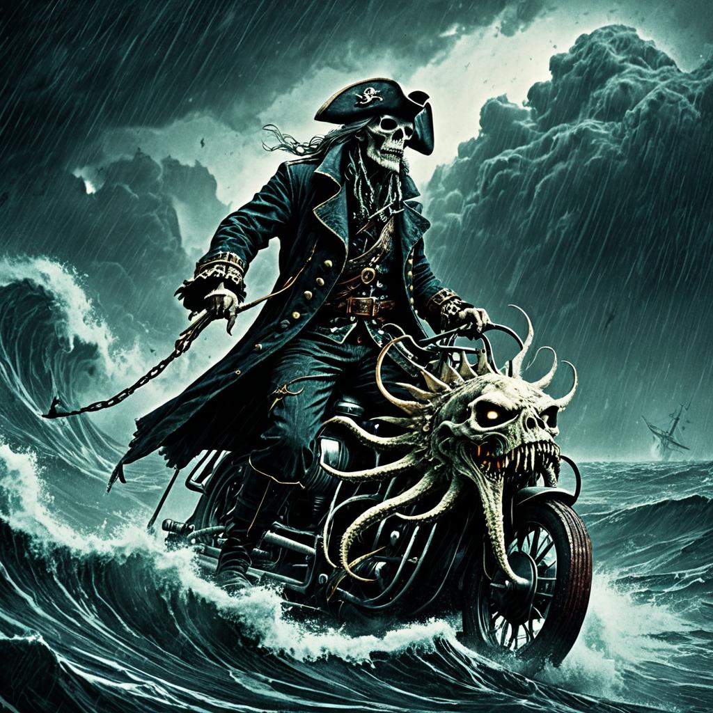 Zeppelin A trippy, hellish android, wearing a futuristic jumpsuit, riding a hoverboard, set in a digital landscape. Inspired by Masamune Shirow, hyper-real with intricate outlines.