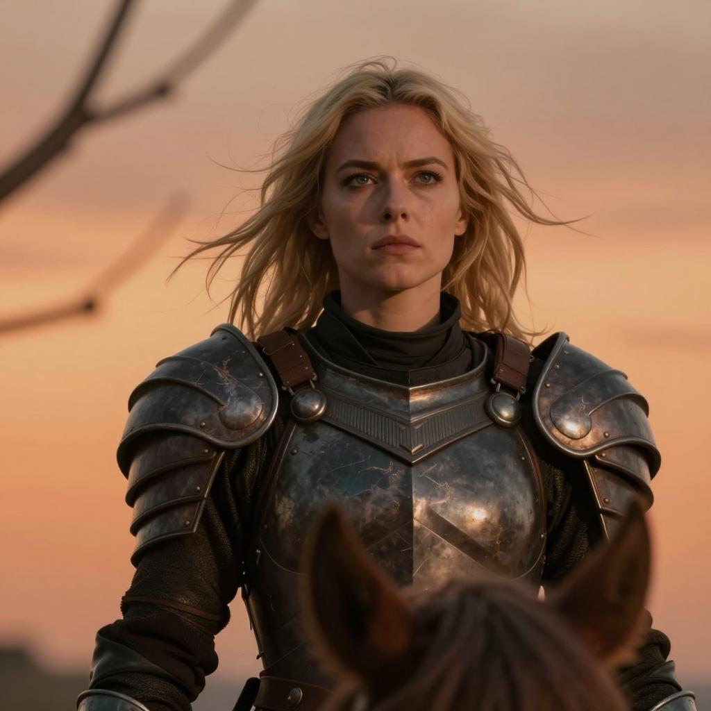 A woman with light brown hair holds a burning torch close to her face, aiming forward with a determined expression. She wears a leather jacket with metal armor pieces. The background is dark with a warm, orange glow from the torch. Her right hand grips the torch while her left hand holds the torch's handle. The image shows a close-up of her face and upper body. The torch's flame is bright yellow and orange. The setting suggests an underground or cave-like environment.