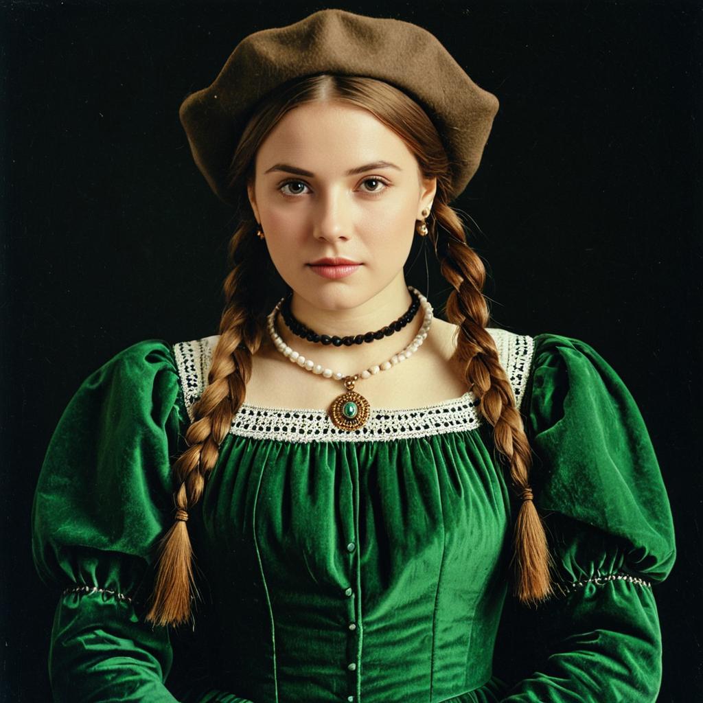 German historical clothing,1girl, solo, dress, realistic, braid, blonde hair, looking at viewer, long sleeves, corset, brown hair, standing, closed mouth