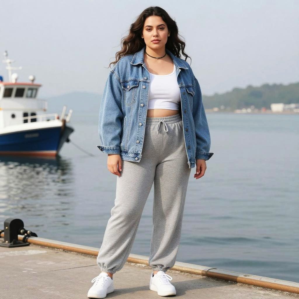 A Curvy woman in a Shueisha style, dressed in an oversized light blue denim jacket, white crop top, and relaxed-fit grey sweatpants, standing on a pier with a boat passing by, white sneakers on her feet and a simple choker necklace adorning her neck, long wavy hair flowing in the breeze. Sexy. Pretty face and beutiful eyes