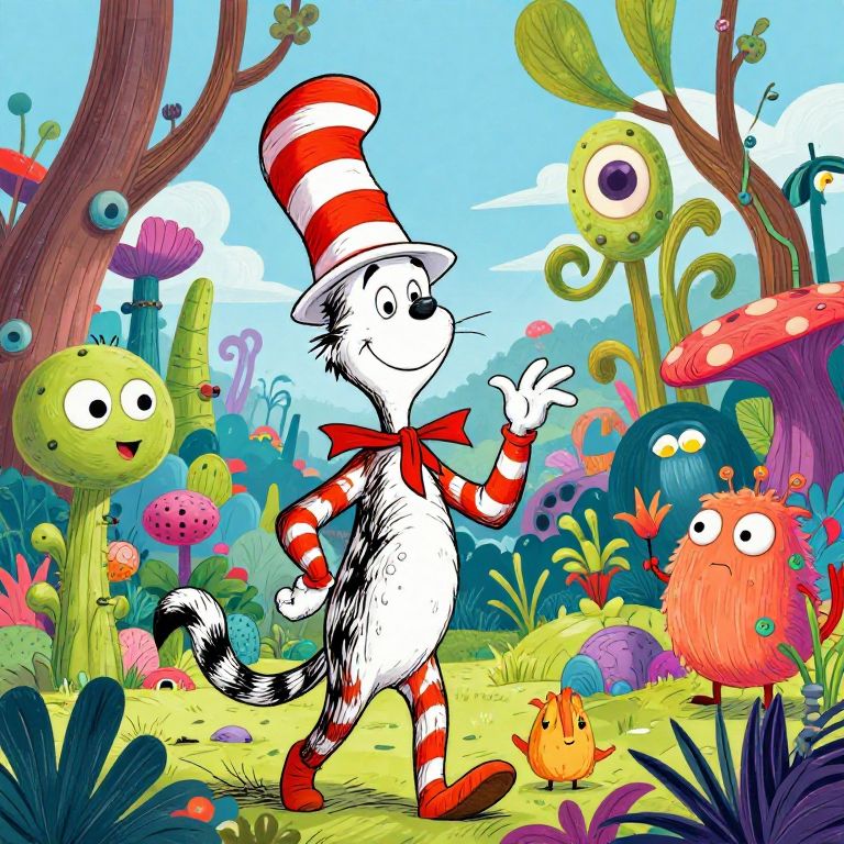 Colorful cartoon of a white cat with red stripes and a tall hat, walking in a whimsical garden with quirky plants and creatures. Bright, playful