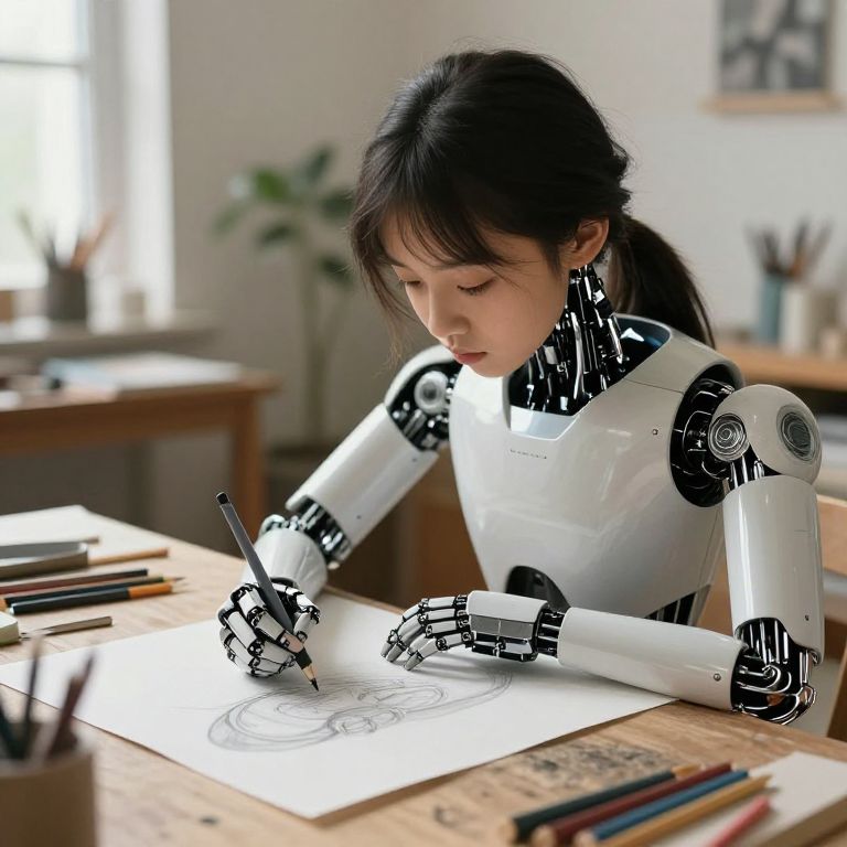 AI girl drawing, a humanoid robot with delicate features creating a beautiful pencil sketch on paper, soft gradients, blend of organic and mechanical elements, warm natural light, realistic textures, inspiring creativity in a serene room filled with art supplies
