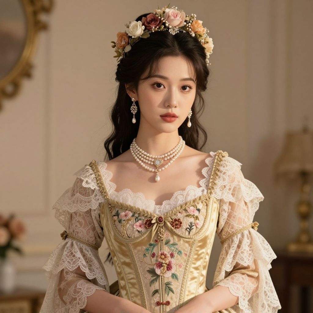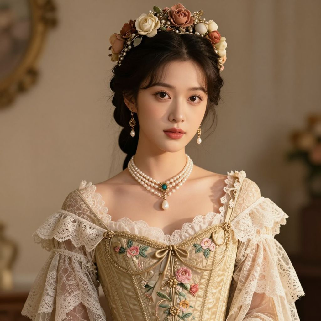 Photograph of an East Asian woman with fair skin and dark hair styled in an elegant updo, adorned with a floral crown featuring roses and leaves. She wears an ornate, Victorian-style dress with a gold corset, lace trim, and floral embroidery. Her dress has off-the-shoulder sleeves with lace. She has a pearl necklace with a central pendant and matching earrings. Her makeup is subtle, with a soft pink lip. The background is a blurred, warmly lit interior with vintage decor, including a framed picture and a floral arrangement. The image exudes a timeless, romantic aesthetic.