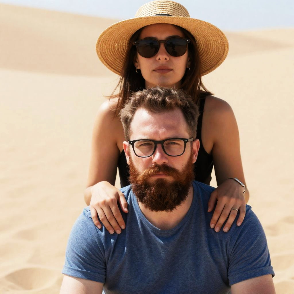 Woman with light brown hair in a messy bun, wearing sunglasses, light blue button-up shirt, and brown pants, standing in a rocky desert landscape. She has a backpack and looks to the right. Background includes distant hills and scattered rocks.