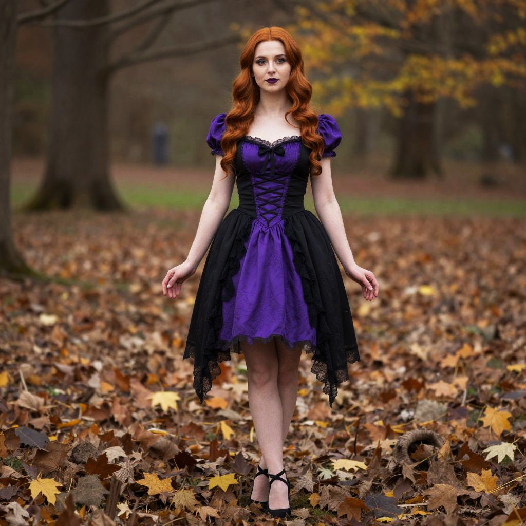 Hocus Pocus Costume Sarah, woman in a purple and black dress standing in a field of leaves