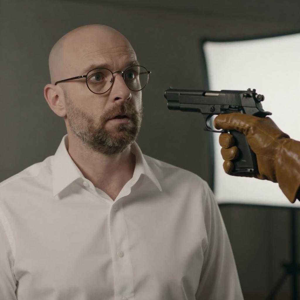 Photograph of a bald, middle-aged man with glasses and a beard, wearing a white shirt, looking up with a surprised expression. A hand in a brown leather glove points a black handgun at him from the right. Background is dimly lit with a bright white light source on the right.