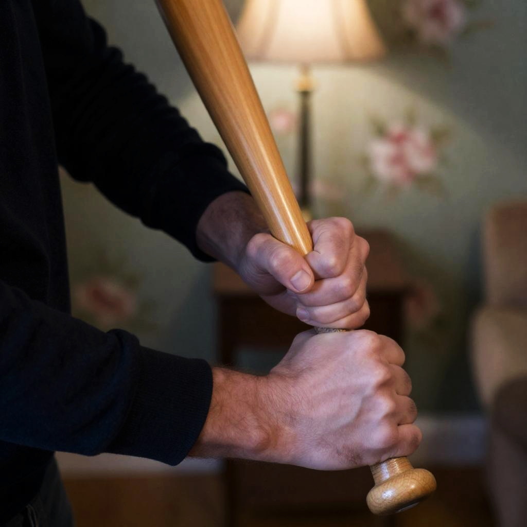 Close-up photograph of a man's hands gripping a wooden baseball bat. He wears a dark long-sleeve shirt. Background features floral wallpaper, a lit lamp, and a partially visible chair. Dim lighting. Man's skin is pale. Bat handle in right hand, bat shaft in left hand. Intense grip.