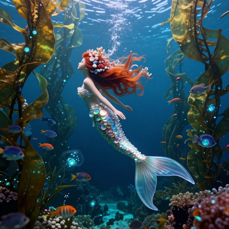 An enchanting underwater scene captures an ethereal mermaid with flowing tendrils of iridescent seashells and coral forming her vibrant auburn hair. The unique perspective highlights the captivating creature from below, showcasing her translucent fins gracefully propelling her through a mesmerizing tapestry of kelp forests as their undulating fronds dance in harmony with the currents. As she navigates this fantastical marine realm, an array of jewel-toned fish and swirling schools of luminescent plankton illuminate her surroundings with an ever-changing palette of colors, casting captivating shadows that evoke a profound sense of wonder and mystery within the deep, reminiscent of the intricate glass sculptures by master artisans known for their delicate craftsmanship.