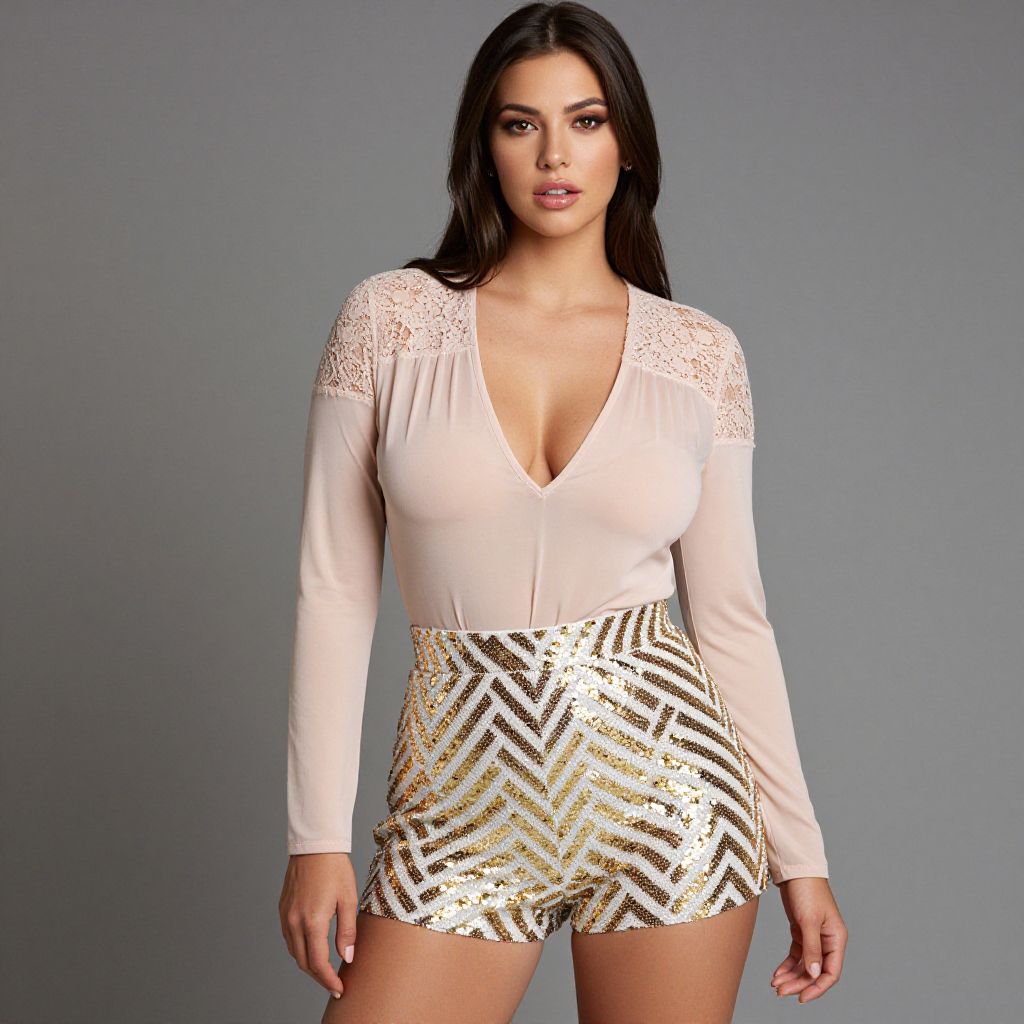 "Woman, chic, blush pink blouse with sheer panels, long sleeves, lace shoulder accents, deep V-neck, sequined shorts with gold and white zigzag pattern, fitted, high-waisted.. Sexy. Pretty face and beаutiful eyes. Big breasts."