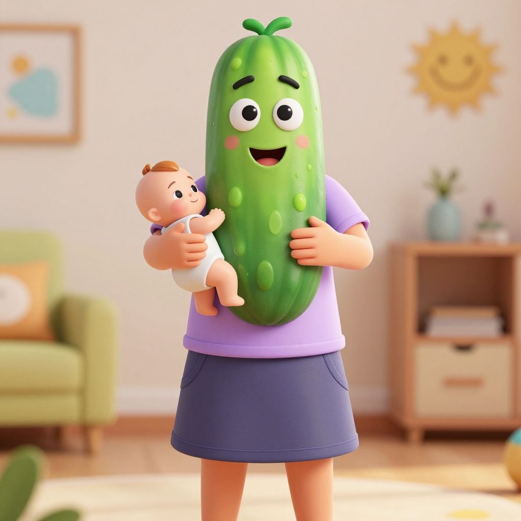 Lustiges kitchen chaos with anthropomorphic vegetables dancing around cooking pots, colorful tiled walls, exaggerated facial features on food items, bright daylight streaming through window, warm and inviting color palette, humorous and lively composition