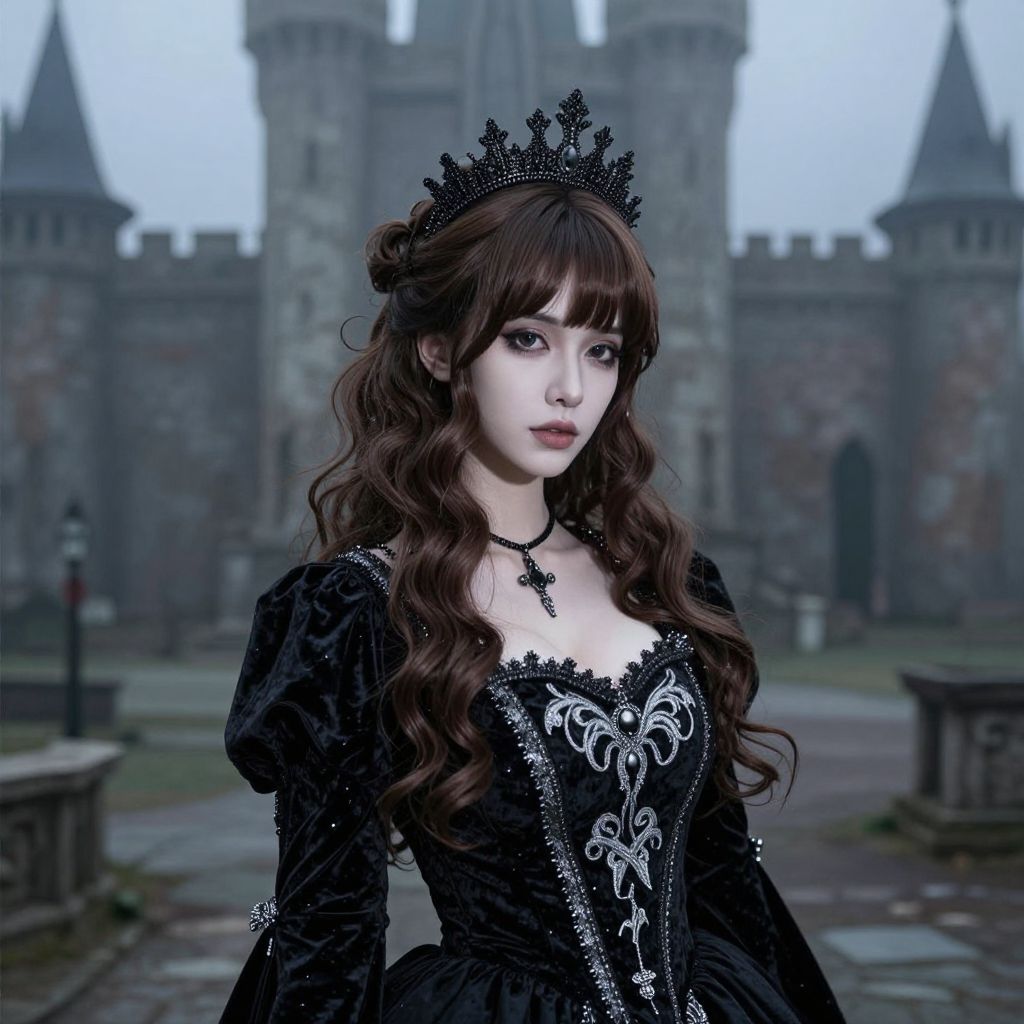 A digital artwork of a young woman with fair skin and long, wavy brown hair wearing a black, ornate gothic dress with intricate white embroidery. She has a black, jeweled crown and a black cross necklace. Her large, purple eyes are striking, and she has a slight, mysterious smile. The background features a blurred, medieval castle with tall, stone towers and a cobblestone courtyard. The overall color palette is dark and moody, with a blueish hue. The style is reminiscent of gothic and fantasy art.